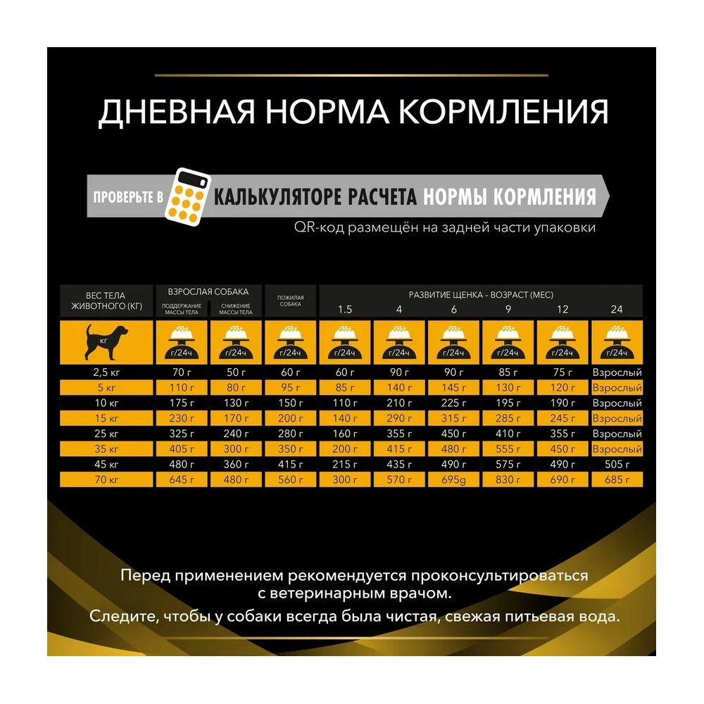 | Дополнительная информация | для собак весом более 70 кг: на каждые дополнительные 5 кг веса добавляйте 35 г корма для поддержания веса у взрослых собак, 10 г для снижения веса у взрослых собак и 30 г для питания пожилых собак, для щенков в возрасте до 3 месяцев разделите рекомендуемую суточную норму корма на 3–4 приема и давайте его размоченным, по достижении трехмесячного возраста постепенно снижайте количество воды, добавляемой для размачивания корма; рекомендуемый начальный период применения — до 3 месяцев; для нормализации массы тела давайте указанное в таблице количество корма, пока собака не начнет сбрасывать вес, затем следуйте указаниям ветеринара до достижения оптимальной массы тела |