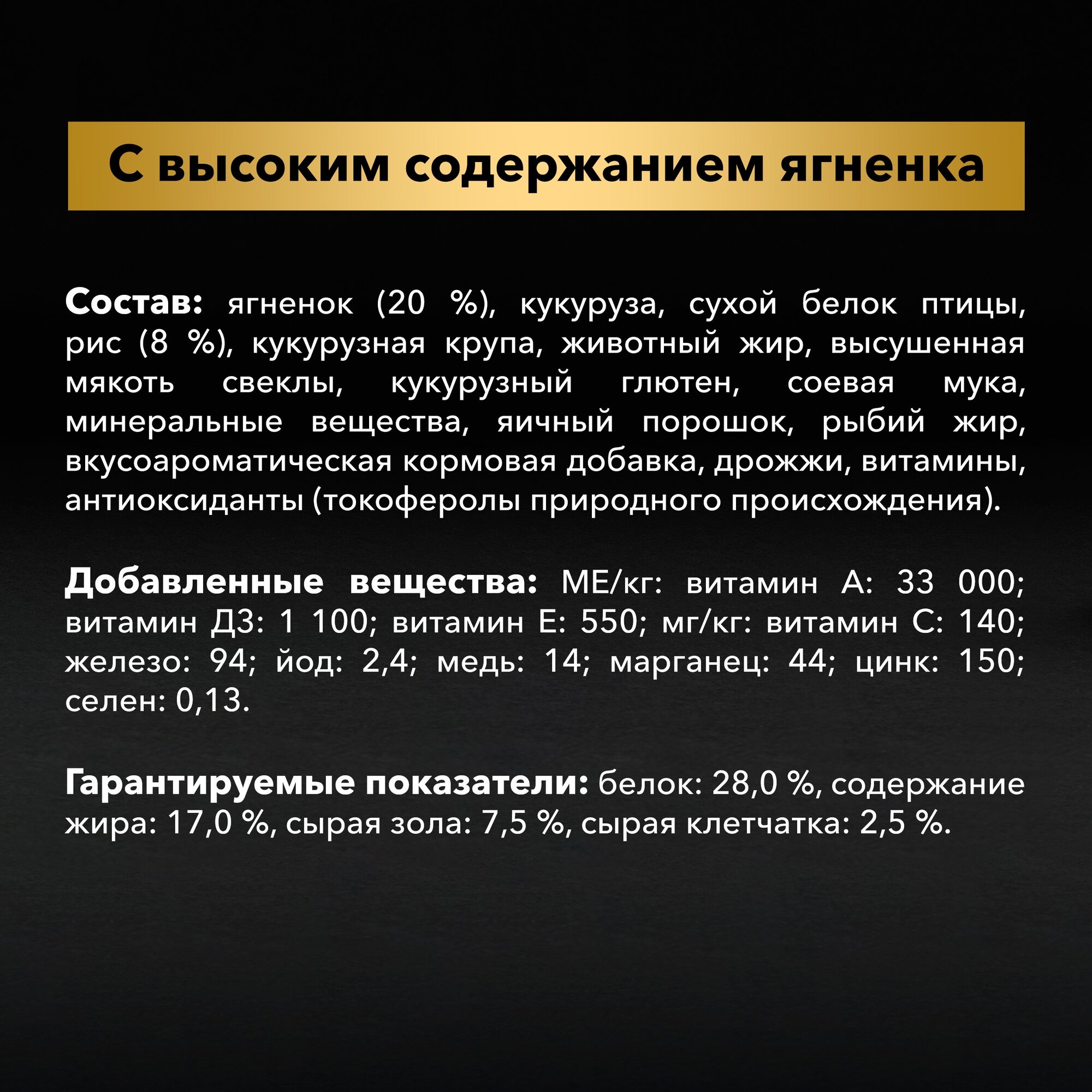| Состав | ягненок (20%), кукуруза, сухой белок птицы, рис (8%), кукурузная крупа,животный жир, сухая мякоть свеклы, кукурузный глютен, продукты переработки растительного сырья, минеральные вещества, яичный порошок, рыбий жир, вкусоароматическая кормовая добавка, дрожжи, витамины, антиоксиданты (токоферолы природного происхождения) |