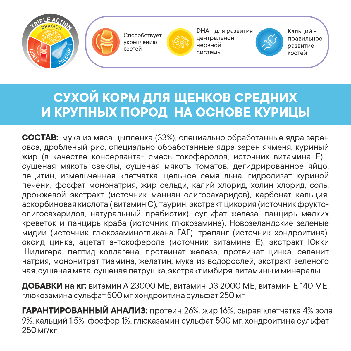 | Состав | мука из мяса цыпленка, овсяная крупа, дробленый рис, перловая крупа, куриный жир (в качестве консерванта — смесь токоферолов, источник витамина Е) , сушеная мякоть свеклы, сушеная мякоть томатов, дегидрированное яйцо, лецитин, измельченная клетчатка, цельное семя льна, гидролизат куриной печени, фосфат мононатрия, жир сельди, калий хлорид, холинхлорид, соль, кальция пропинат (в качестве консерванта), дрожжевой экстракт, карбонат кальция, аскорбиновая кислота ( витамин С), таурин, экстракт цикория (источник инулина), сульфат железа, сульфат глюкозамина, оксид цинка, ацетат ɑ-токоферола (источник витамина Е), хондроитин сульфат, экстракт Юкки Шидигера, пептид коллагена, протеинат железа, протеинат цинка, селенит натрия, мононитрат тиамина, мука из водорослей, экстракт зеленого чая, сушеная мята, сушеная петрушка, сульфат меди, йодат кальция, пиридоксина гидрохлорид, оксид марганца, протеинат марганца, экстракт имбиря, никотиновая кислота,d-пантотенат кальция, супплемент витамина A, протеинат меди, холикальцеферол ( витамин D3), фолиевая кислота, рибофлавин,бисульфат менадиона никотинамида (витамин K3), биотин, супплемент витамина B12 , биотин, карбонат кобальта |