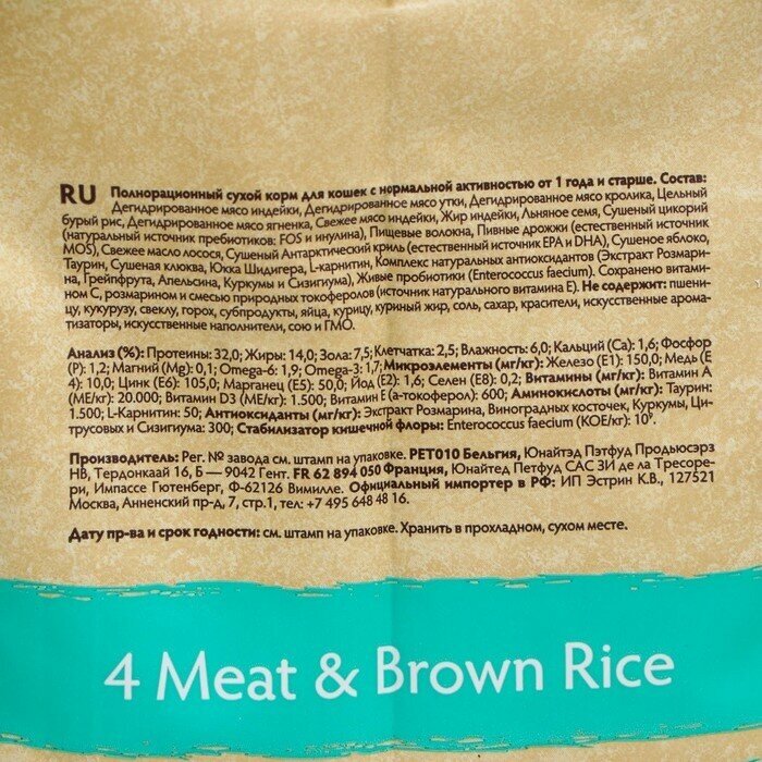 | Состав | дегидрированное мясо индейки, дегидрированное мясо утки, дегидрированное мясо кролика, цельный бурый рис, дегидрированное мясо ягненка, свежее мясо индейки, жир индейки, льняное семя, сушеный цикорий (натуральный источник пребиотиков: fos и инулина), пищевые волокна, пивные дрожжи (естественный источник mos), свежее масло лосося, сушеный антарктический криль (естественный источник epa и dha), сушеное яблоко, таурин, сушеная клюква, юкка шидигера, l-карнитин, комплекс натуральных антиоксидантов (экстракт розмарина, грейпфрута, апельсина, куркумы и сизигиума), живые пробиотики (enterococcus faecium), сохранено витамином с, розмарином и смесью природных токоферолов (источник натурального витамина е) |