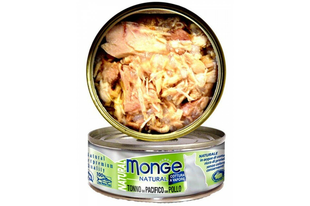 Влажный корм Monge Cat Natural для кошек, из тихоокеанского тунца с курицей, консервы 80 г