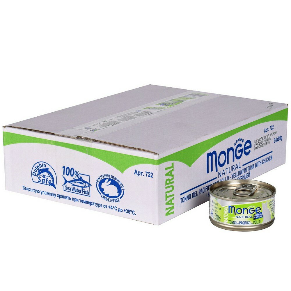 Влажный дополнительный корм Monge Cat Natural для кошек, из тихоокеанского тунца с курицей, 80г х 24шт.
