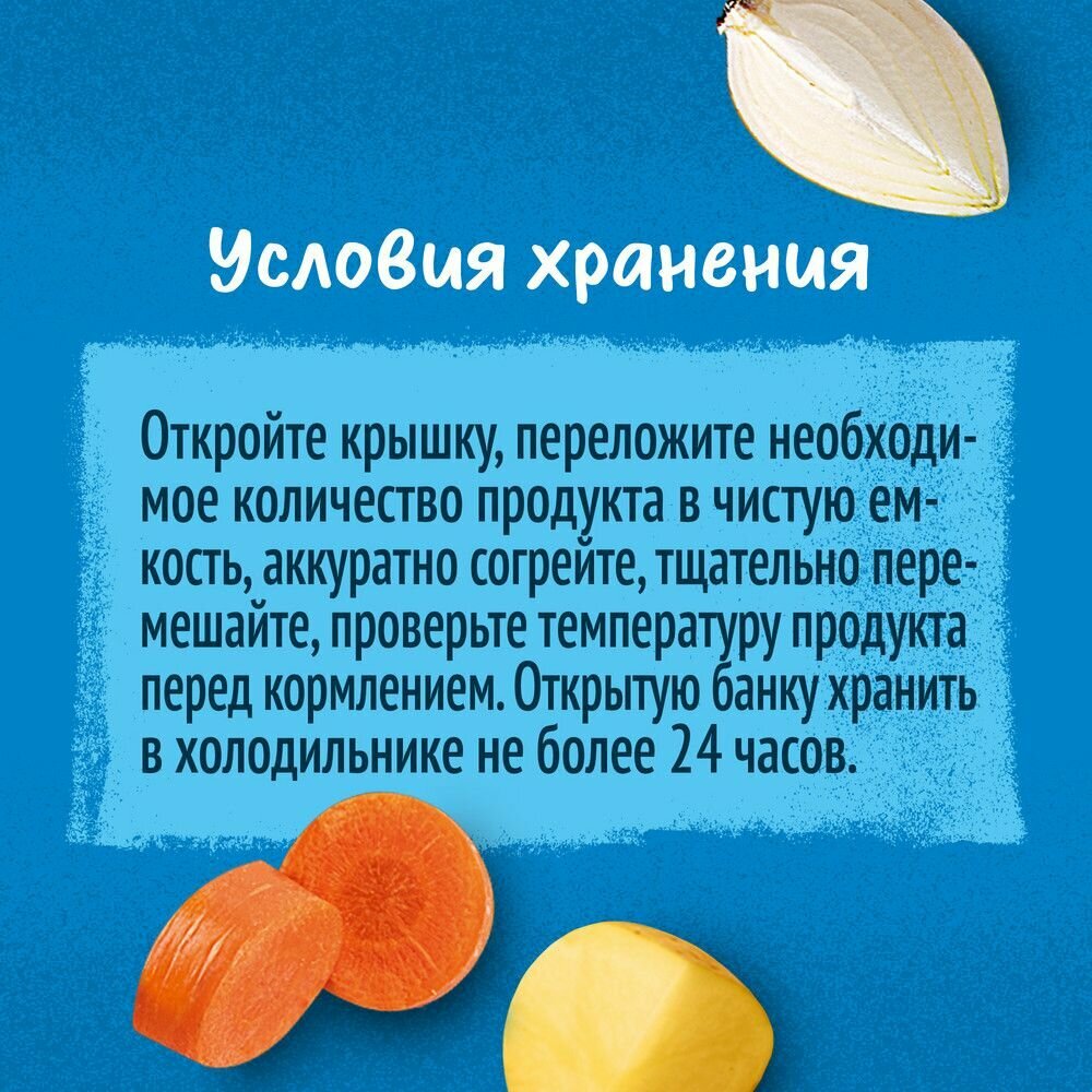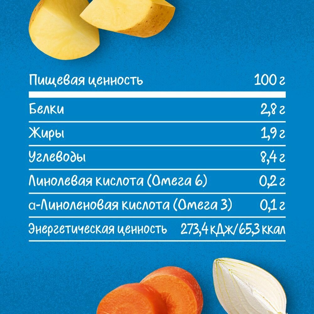 | Состав | картофель (40%), морковь (15,4%), пастернак (15,4%), вода, говядина (8,5%), лук (4,6%), низкоэруковое рапсовое масло |