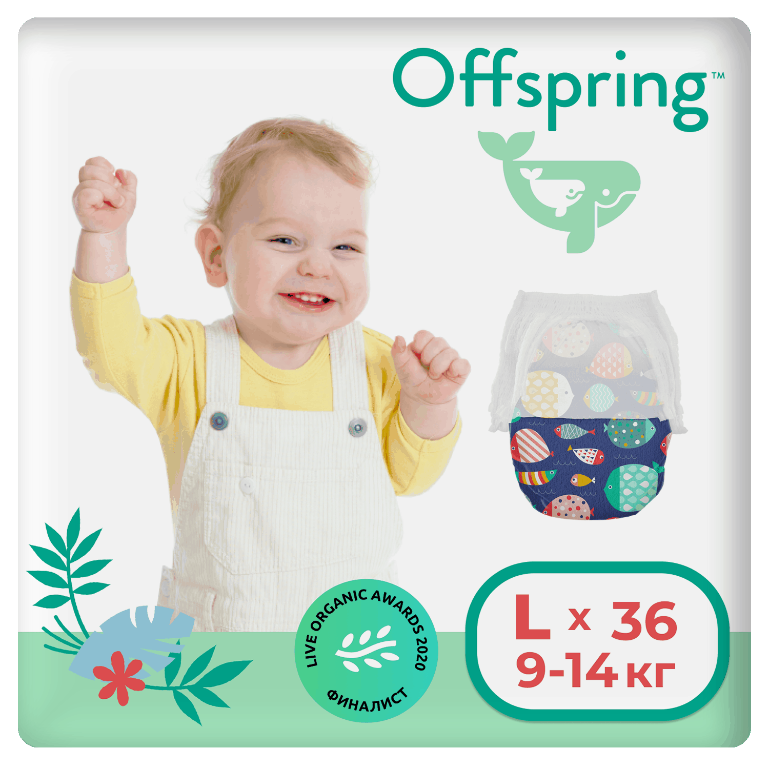 Трусики-подгузники Offspring, L 9-14 кг. 36 шт. расцветка Рыбки