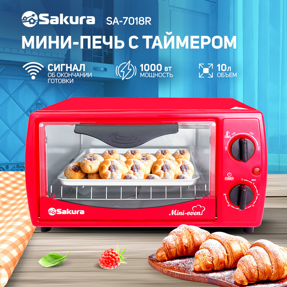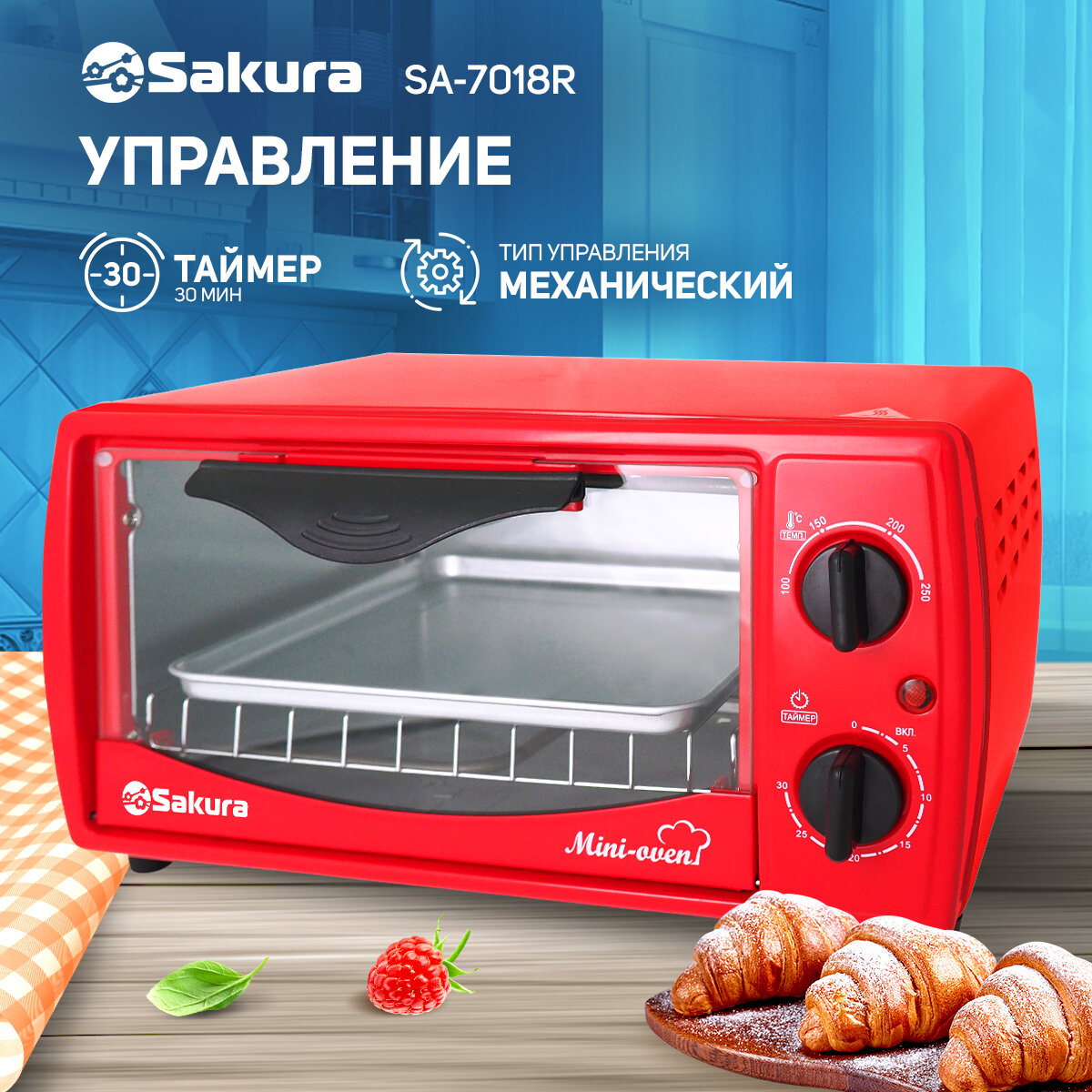 Мини-печь Sakura Sa-7018r, 1000 Вт, 10 л, 100-250С, таймер, красная Sakura 9438288 .