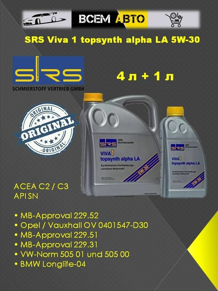 SRS Srs 4033885000540 Viva 1 Topsynth Alpha La 5w-30 4l Масло Bmw Longlife-04, Mb 229.31, Mb 229.51, Mb 229.52, Opel Ov040154...