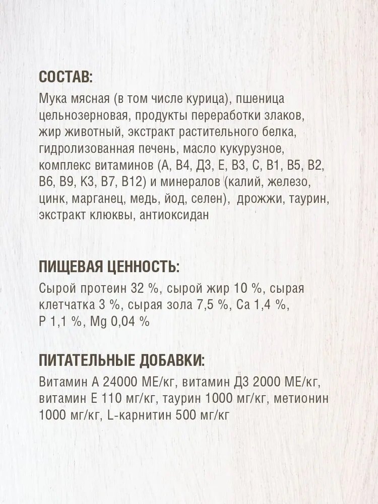 | Состав | мука мясная (в том числе курица), пшеница цельнозерновая, продукты переработки злаков, жир животный, экстракт растительного белка, гидролизованная печень, масло кукурузное, комплекс витаминов (А, В4, Д3, Е, В3, С, В1, В5, В2, В6, В9, К3, В7, В12) и минералов (калий, железо, цинк, марганец, медь, йод, селен), дрожжи, таурин, экстракт клюквы, антиоксидант |