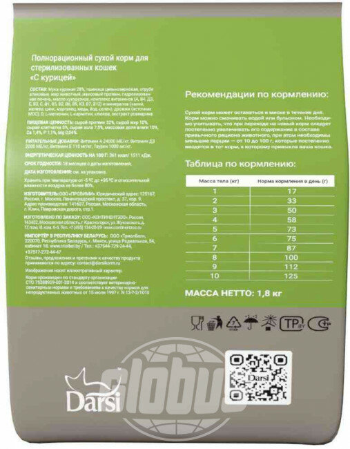 Darsi корм для стерилизованных взрослых кошек всех пород, курица 1,8 кг