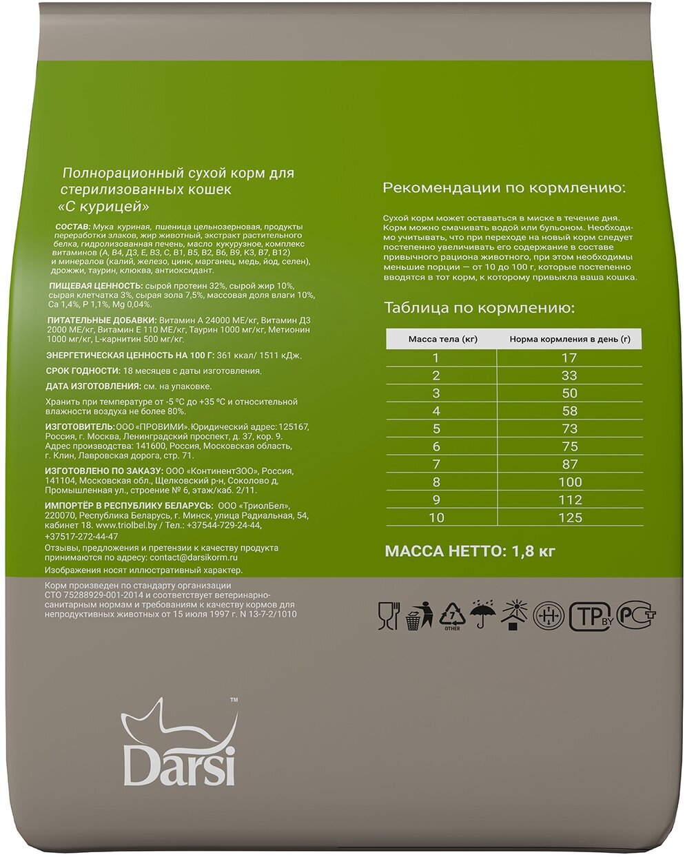 Корм Darsi для стерилизованных кошек и котов Курица, 1.8 кг