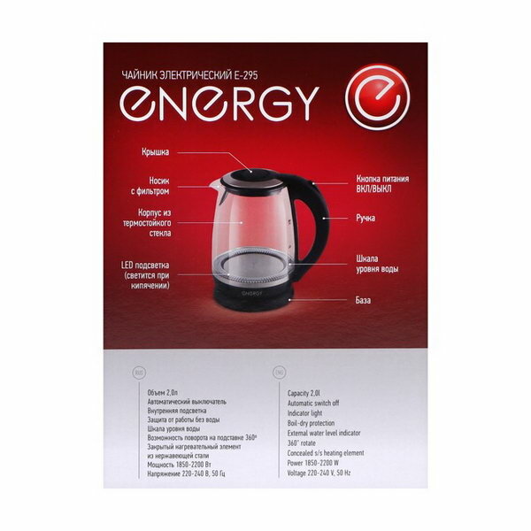 Energy Чайник электрический ENERGY E-295, стекло, 2 л, 2200 Вт, чёрный