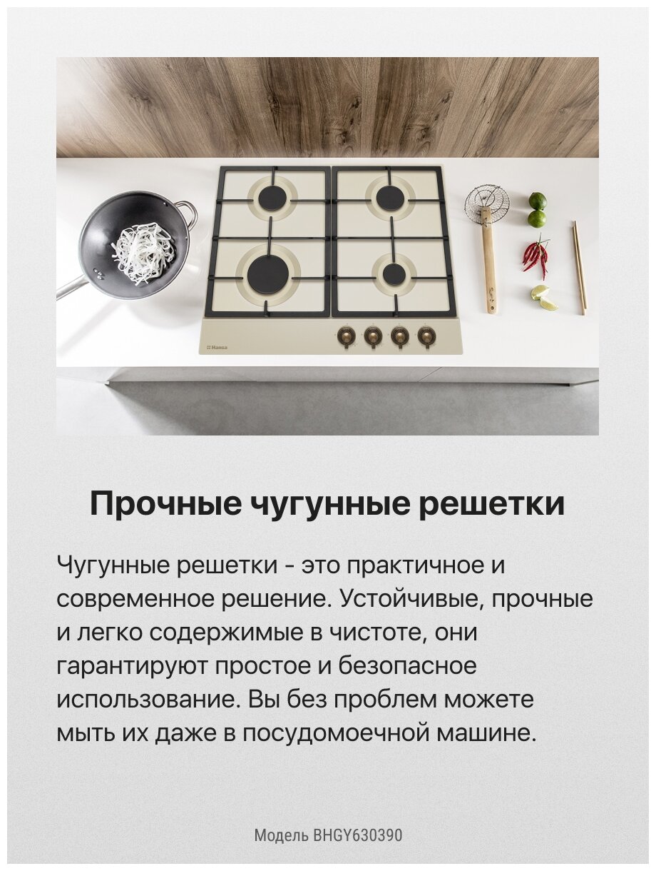 Газовая варочная панель Hansa BHGY630390, встраиваемая, 60 см, газ-контроль и автоподжиг на всех конфорках, чугунные решетки, бежевая в ретро стиле
