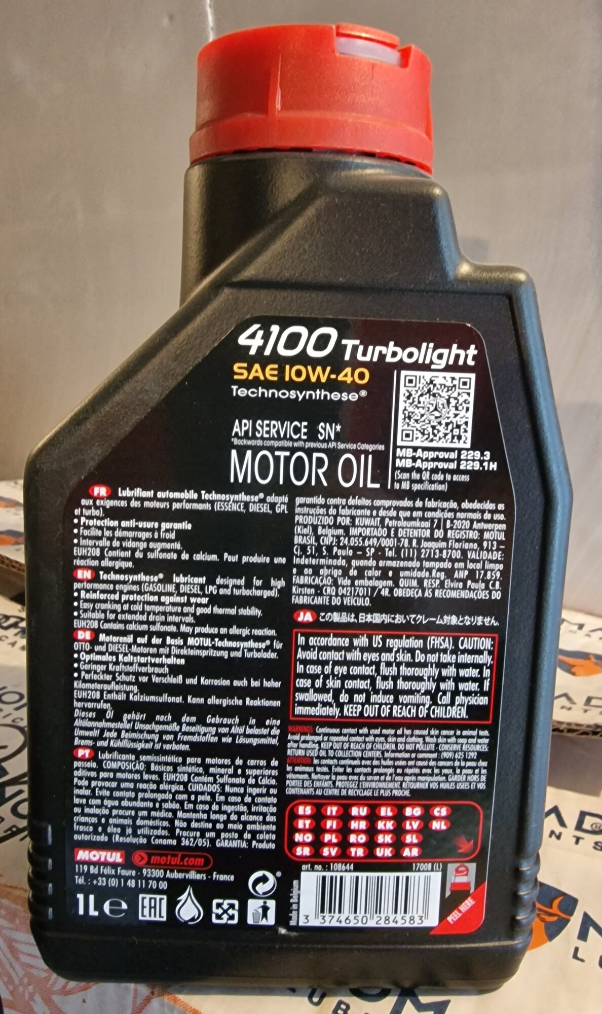 Масло моторное MOTUL 4100 Turbolight 10w40 полусинтетическое, SN/CF, ACEA A3/B4, универсальное, 1л, арт. 6727
