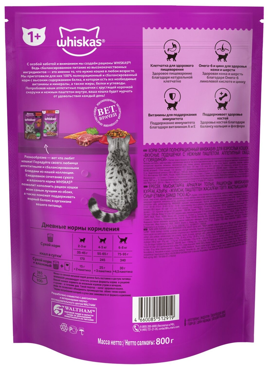 Корм сухой Whiskas для кошек подушечки/паштет Говядина 800г / 1 шт