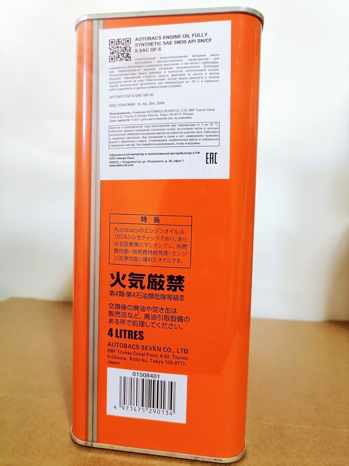 Синтетическое моторное масло Autobacs Fully Synthetic 5W-30 SN/CF/GF-5, 4 л, 3.9 кг, 1 шт