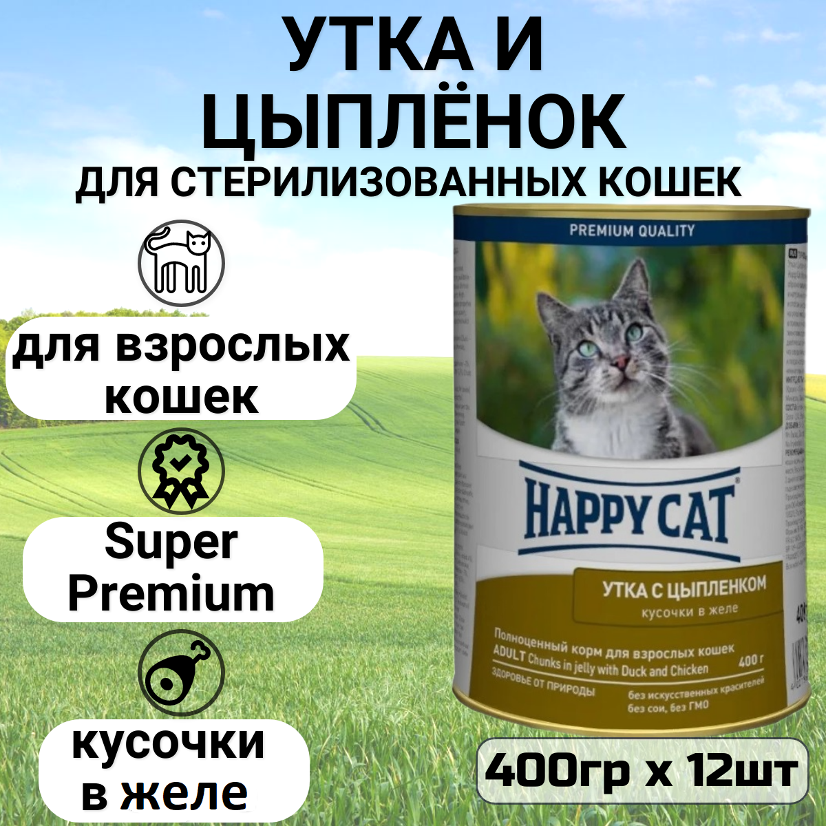 Happy Cat Корм полнорационный консервированный для кошек Утка с Цыпленком Кусочки в желе, 400 г х 12 шт