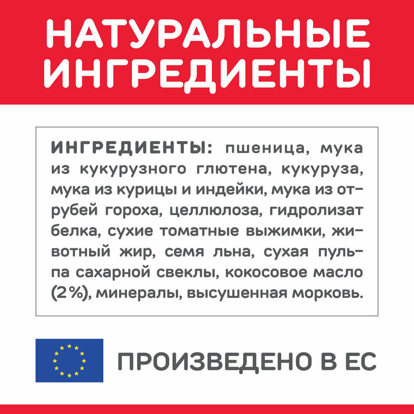 | Состав | пшеница, мука из кукурузного глютена, кукуруза, мука из курицы (курица 7%) и индейки, мука из отрубей гороха, целлюлоза, гидролизат белка, сухие томатные выжимки, животный жир, семя льна, сухая пульпа сахарной свеклы, кокосовое масло (2 %), минералы, высушенная морковь |