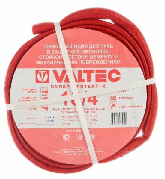 Купить сантех VALTEC теплоизоляция супер протект 18 на 4 мм. бухта 10 м. красная VT.SP.R10R.1804