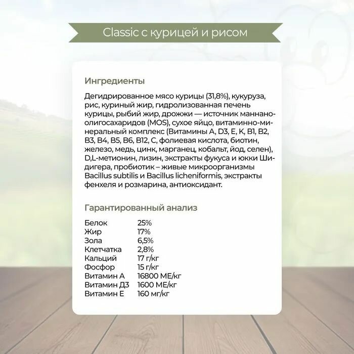 | Минеральные вещества | Белок 25%, Жир 17%, Зола 6,5%, Клетчатка 2,8%, Витамин А 16800 МЕ/кг, Витамин Д3 1600 МЕ/кг, Витамин Е 160 мг/кг, Кальций 17 г/кг, Фосфор 10 г/кг |