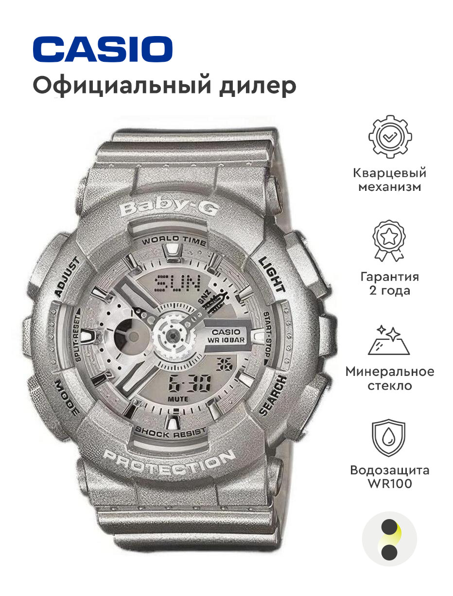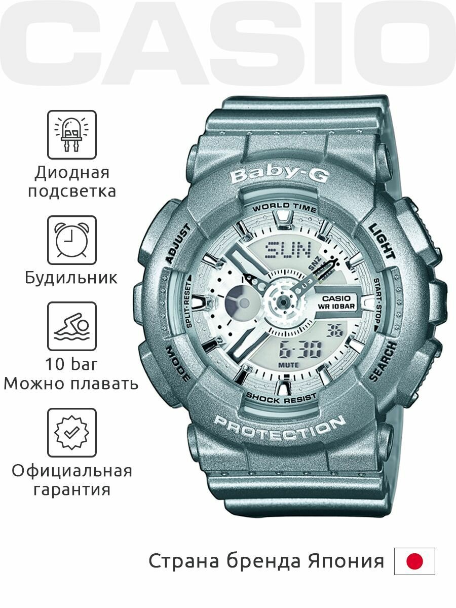 Наручные часы CASIO Baby-G BA-110-8A кварцевые, будильник, секундомер, таймер обратного отсчета, водонепроницаемые, противоударные, подсветка стрелок, подсветка дисплея, серый, серебристый интересное: