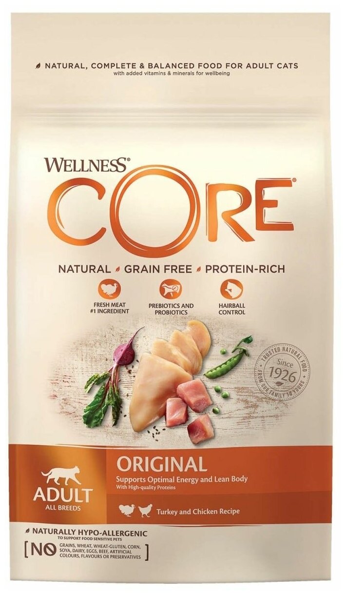 Корм для кошек сухой Веллнес Кор ORIGINAL для взрослых животных гранулы с индейкой и курицей 1.75кг / кошачья еда гипоаллергенная для ежедневного