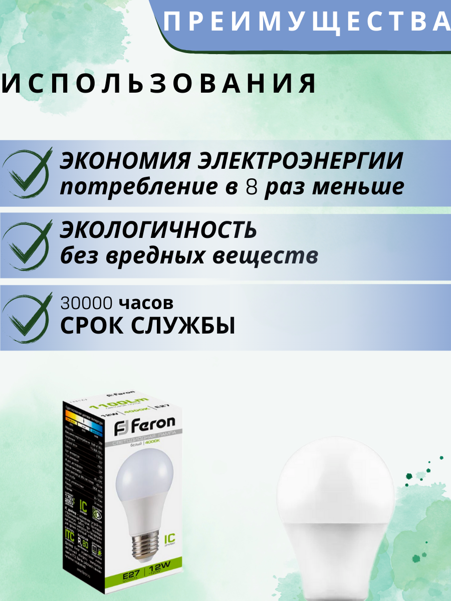 Лампа светодиодная Feron LB-93 25487, E27, A60, 12 Вт, 4000 К