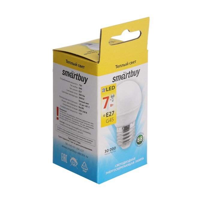 Купить Лампа cветодиодная Smartbuy, G45, Е27, 7 Вт, 3000 К, теплый белый свет