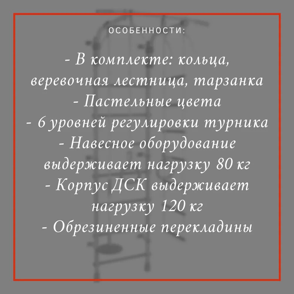 | Комплектация | веревочная лестница / гимнастические кольца / тарзанка / турник |