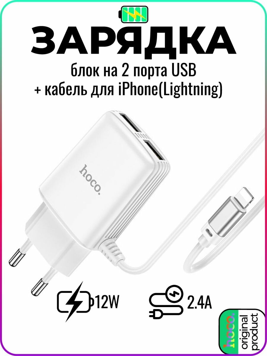 Сетевое зарядное устройство (СЗУ) Hoco C82A (2 USB) + кабель Lightning, 2.4 А, черный