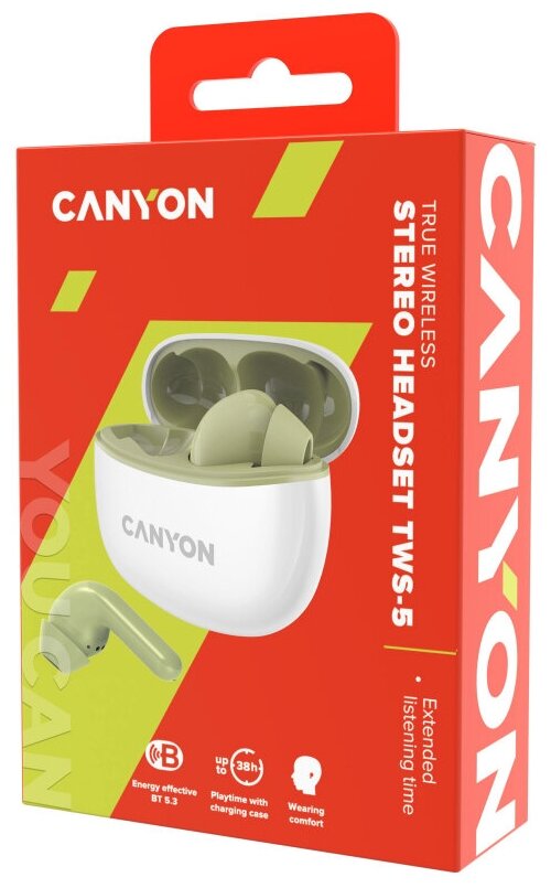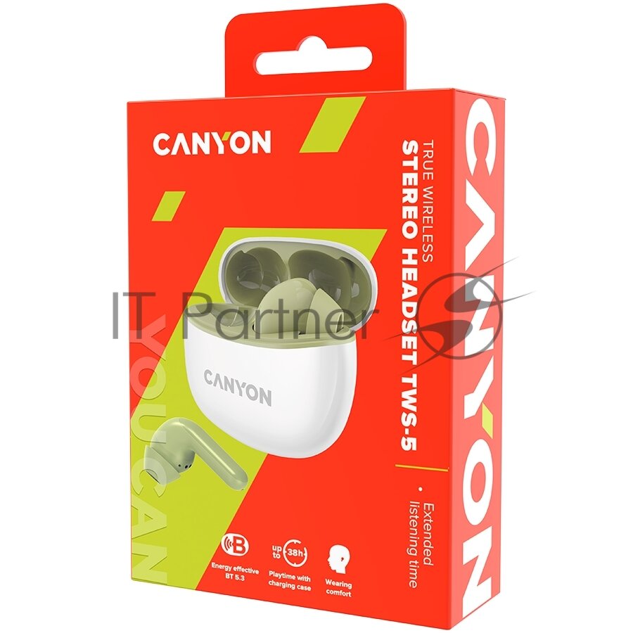 Наушники Canyon TWS-5, вакуумные, микрофон, сенсор, BT 5.3, 40/500 мАч, IP33, зеленые
