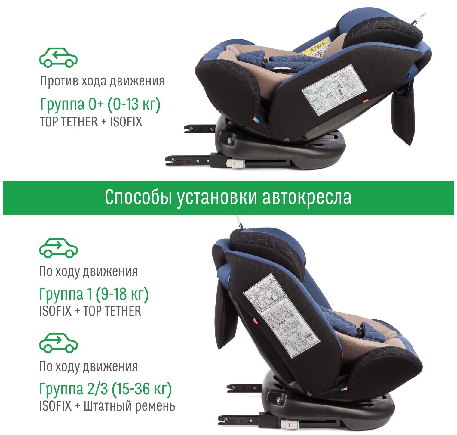 | Особенности установки | фиксатор натяжения штатного ремня / якорный ремень / поворотный механизм |