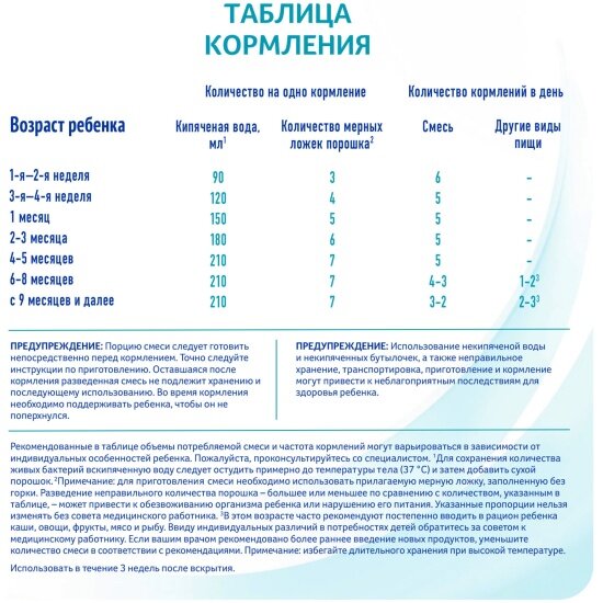| Дополнительная информация | упаковано в модифицированной атмосфере с азотом; рекомендации по приготовлению: прежде чем приступить к приготовлению смеси, вымойте руки; тщательно вымойте бутылочку, соску и крышку, чтобы в них не осталось следов молока; прокипятите их в течение 5 минут; накройте до использования; прокипятите питьевую воду в течение 5 минут и затем остудите до 37°С; руководствуясь таблицей кормления, налейте в прокипяченную бутылочку точно отмеренное количество теплой воды; используйте только мерную ложку, находящуюся в банке, заполненную без горки; руководствуясь таблицей кормления, добавьте точное количество мерных ложек сухого порошка в соответствии с возрастом ребенка; после использования положите мерную ложку на выступ в банке, как показано в инструкции; взболтайте бутылочку до полного растворения порошка; после приготовления смеси банку с порошком следует плотно закрыть и хранить в сухом прохладном месте; условия хранения: до и после вскрытия хранить при температуре не выше 25 °С и относительной влажности воздуха не более 75%, содержимое банки должно быть использовано в течение 3 недель после вскрытия, не рекомендуется хранить в холодильнике |