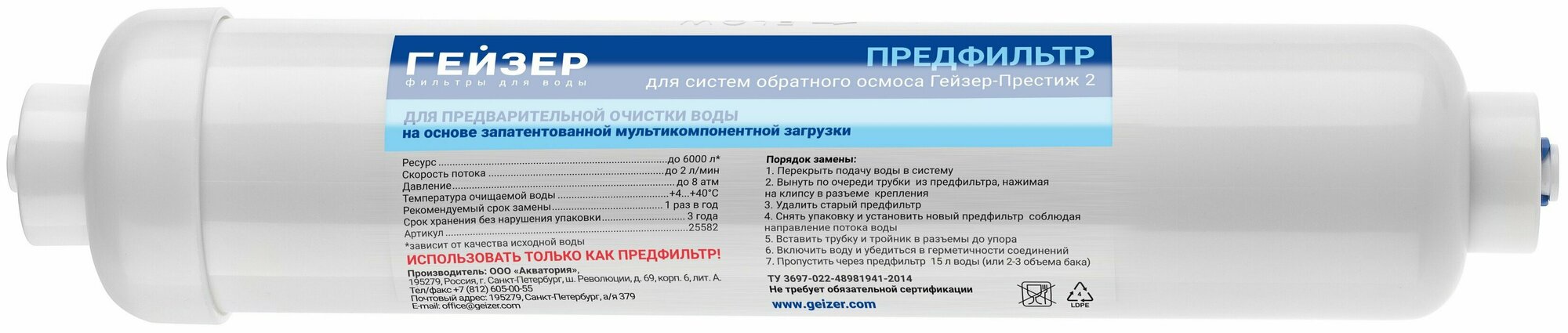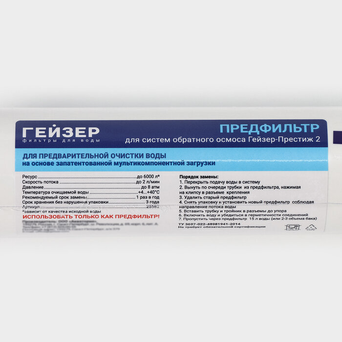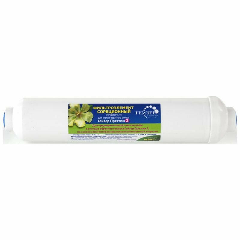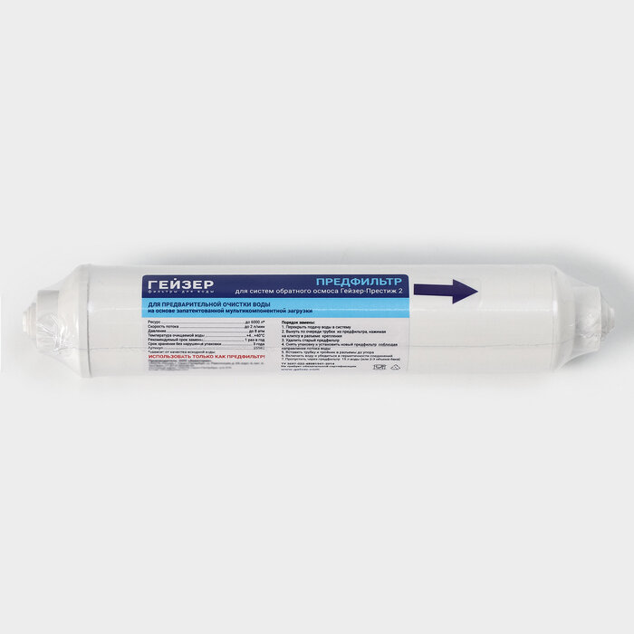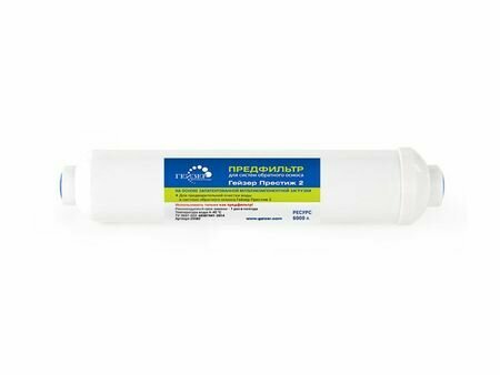| Дополнительная информация | применяется для предварительной очистки воды в компактных обратноосматических системах Гейзер Престиж 2; не комплектуется фитингами |