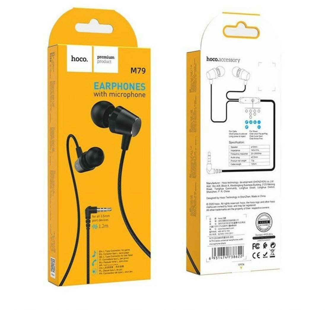 Наушники Hoco M79, проводные, вакуумные, микрофон, Jack 3.5 мм, 1.2 м, черные