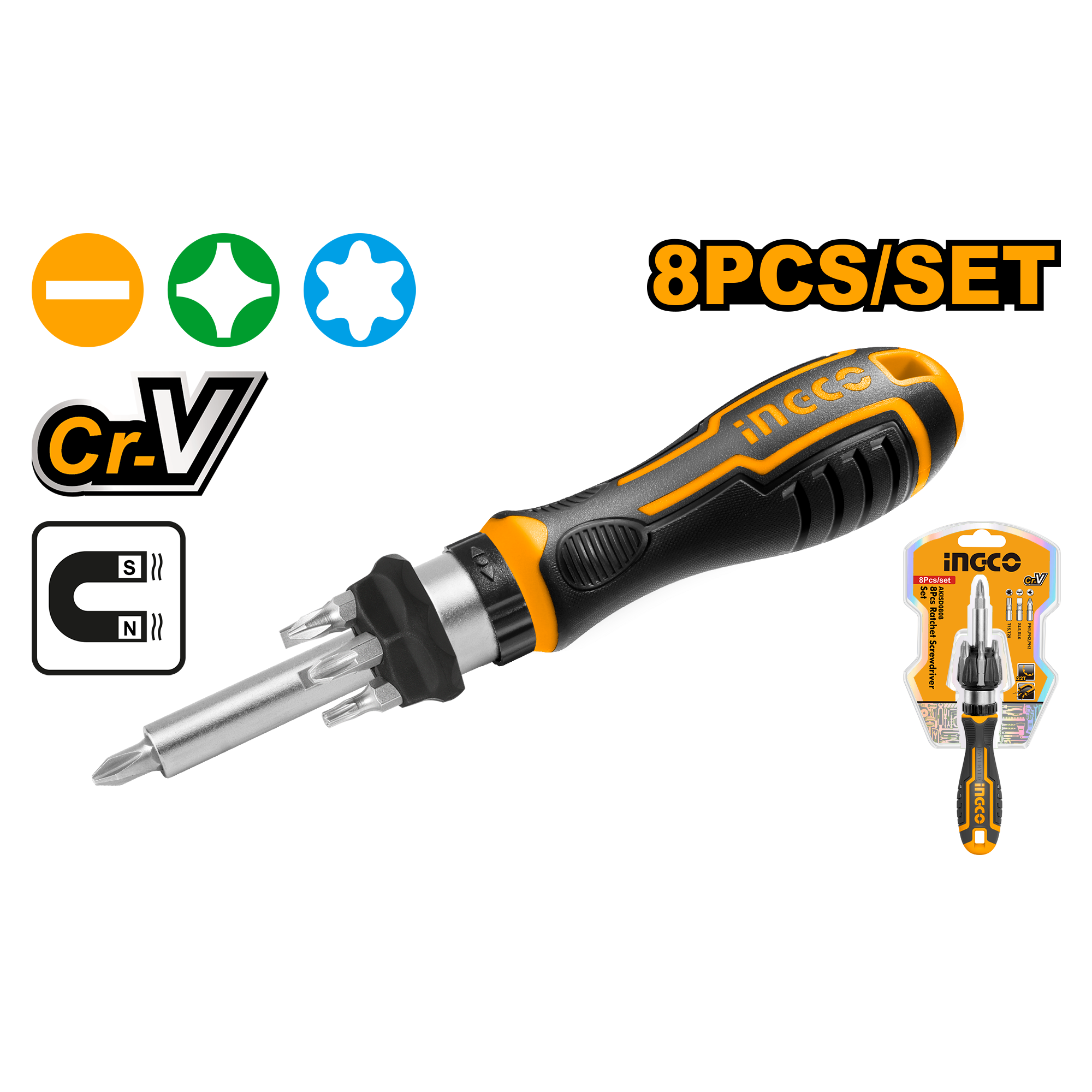 Отвертка с трещоткой и битами INGCO 8 шт