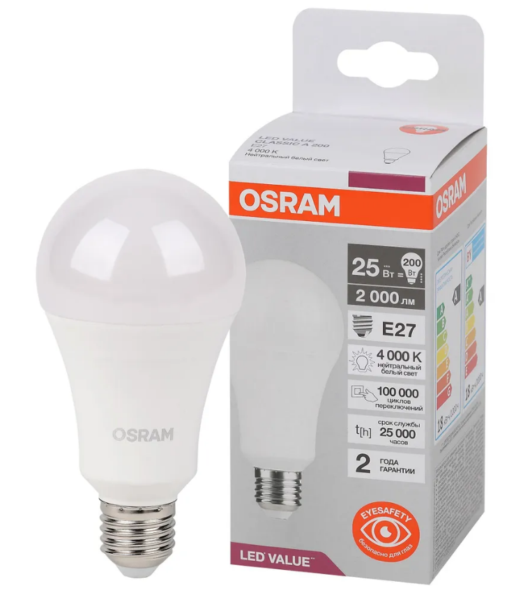 Лампа светодиодная LED Value A 2000лм 25Вт 4000К нейтр. бел. E27 A угол пучка 180град. 220-240В (замена 200Вт) матов. пластик OSRAM 4058075696358 LEDVANCE