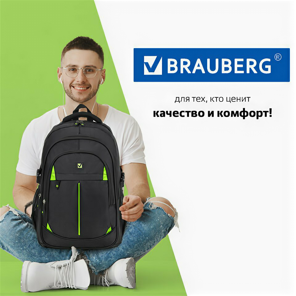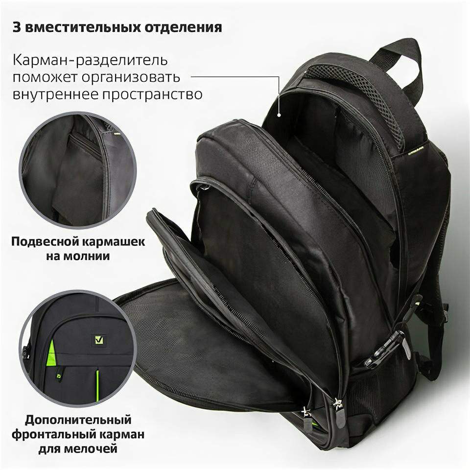 Рюкзак BRAUBERG TITANIUM универсальный, 3 отделения, черный, салатовые вставки, 45х28х18 см, 270766 интересное: