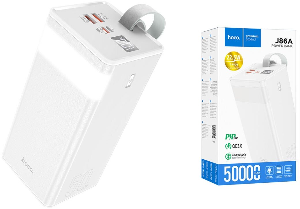 Внешний аккумулятор повербанк Hoco J86A на 50000 mAh. 22.5W QC3.0 PD20W. Белый