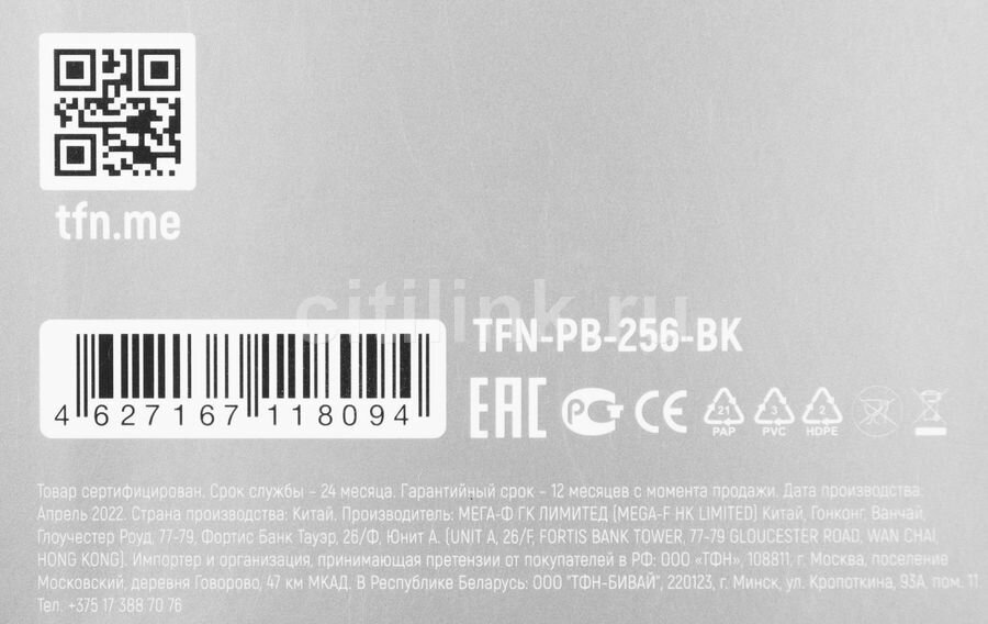 Портативный аккумулятор TFN PB-256, черный, упаковка: блистер