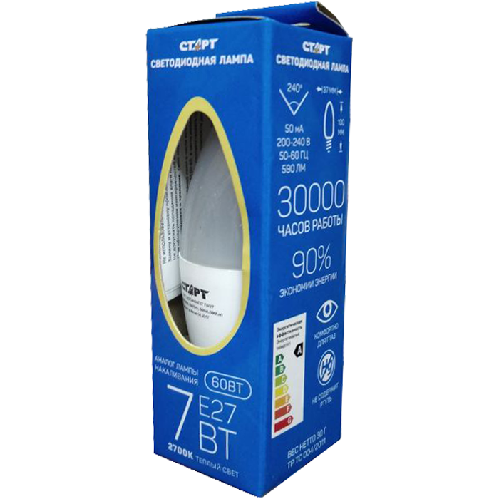 Светодиодная лампа старт LEDCandleE27 7W30 4680024811354