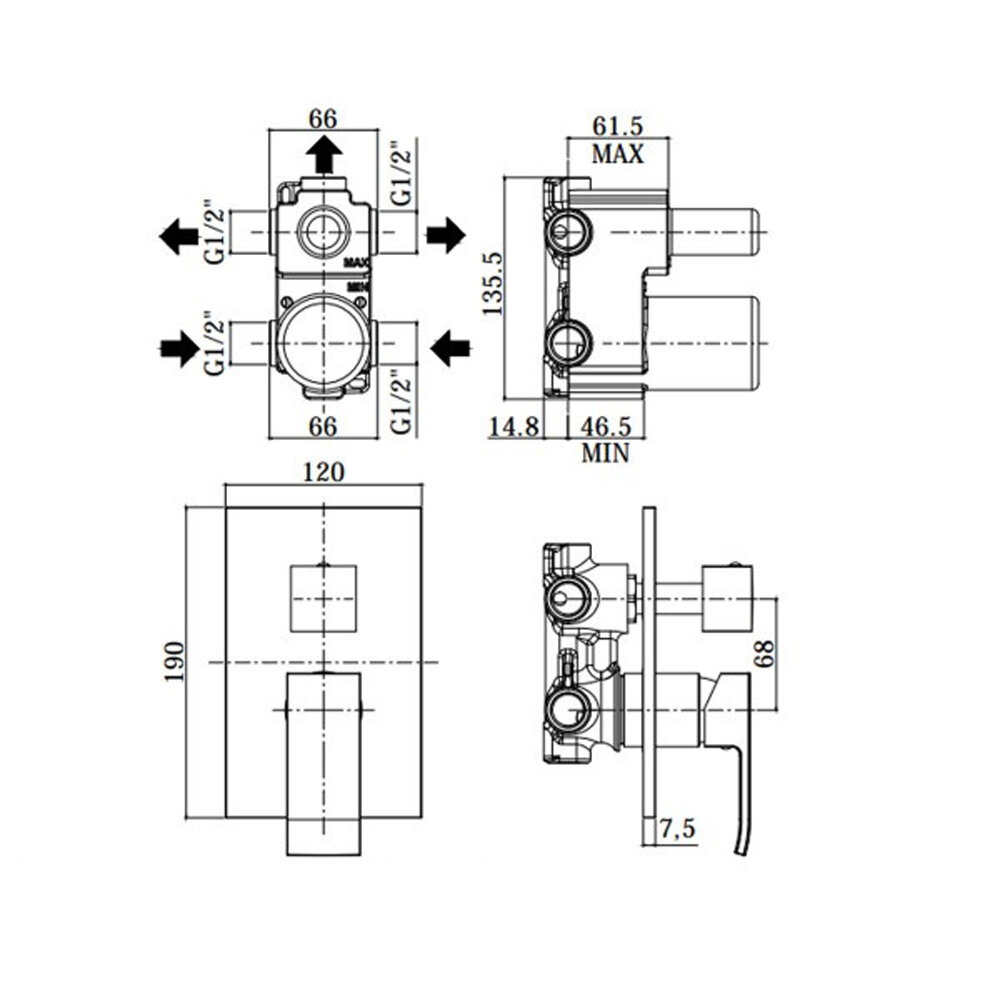 Смеситель встраиваемый для душа на 2 выхода Paffoni ELLE, девиатор-картридж на 2положения+1 комбо положение хром. EL018CR/M