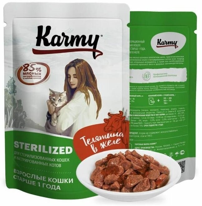 Корм Karmy Sterilized (в желе) для стерилизованных кошек, с телятиной, 80 г x 24 шт