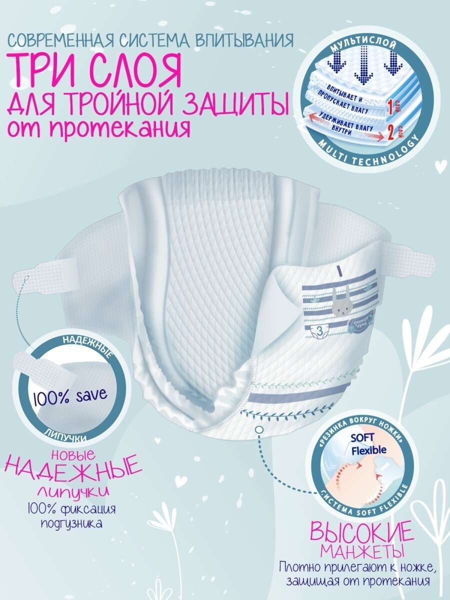 | Плюсы: | Цена - покупал пачку 64 шт. за 300 рублей. Мало чем отличаются от именитых брендов. На ребёнка 9 кг тройка села хорошо, есть небольшие зазоры, но ещё наберём вес и зазоры исчезнут - будет идеально! |
