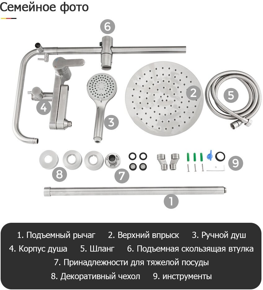 | Дополнительная информация | высота стойки для душа: 1100 мм; диаметр душевой лейки: 110 мм; диаметр верхнего душа: 250 мм |