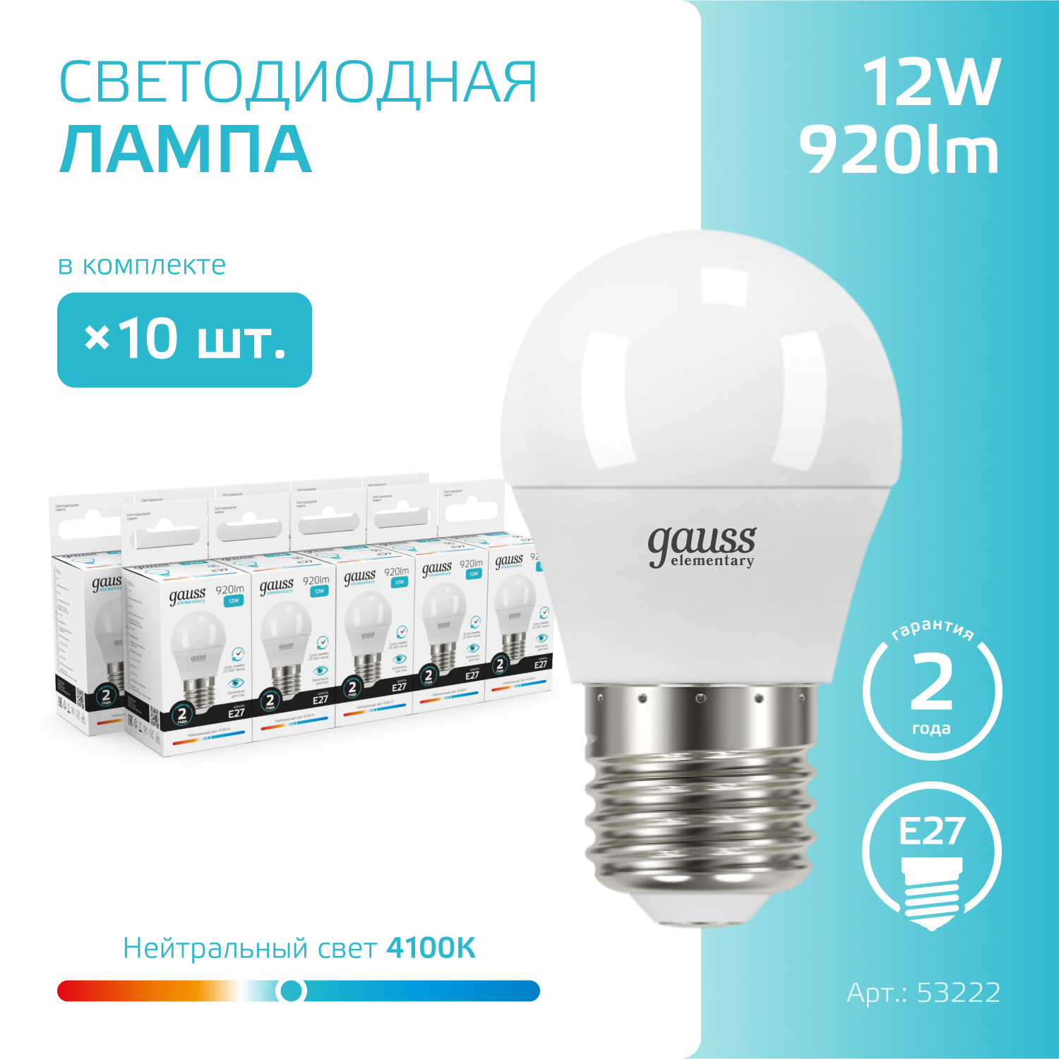 Лампа светодиодная Gauss Elementary 12Вт цок.:E27 шар 220B 4100K св.свеч.бел.нейт. (упак.:10шт) (53222) интересное: