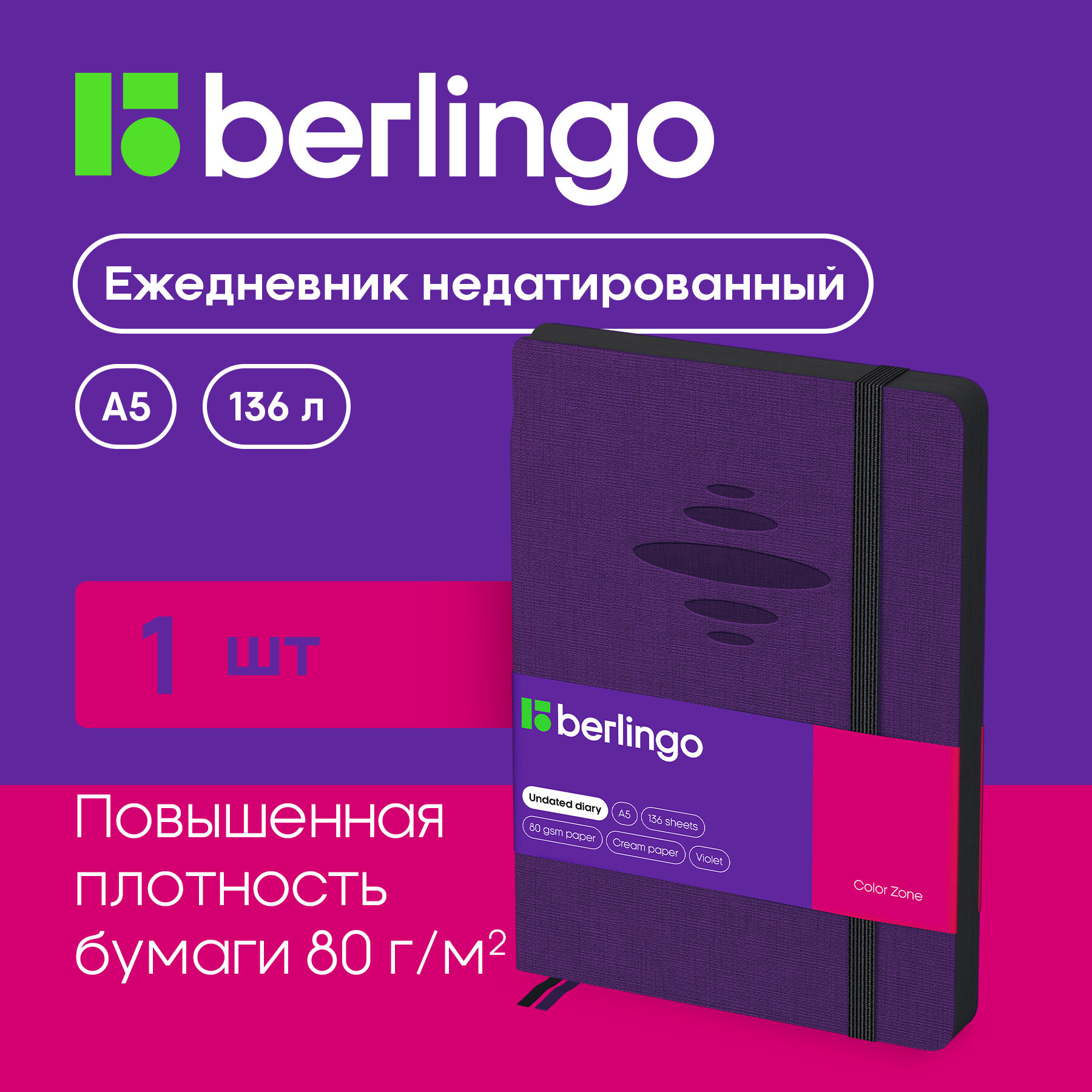 Ежедневник Berlingo недатированный "Color Zone", A5, 136 л, кожзам, черн.срез, с резинкой, фиолетовый