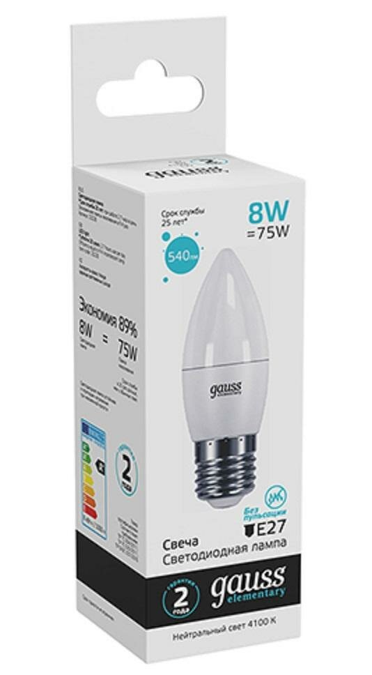 Лампа LED свеча 8W E27 540Лм 4100К Elementary Gauss, 33228