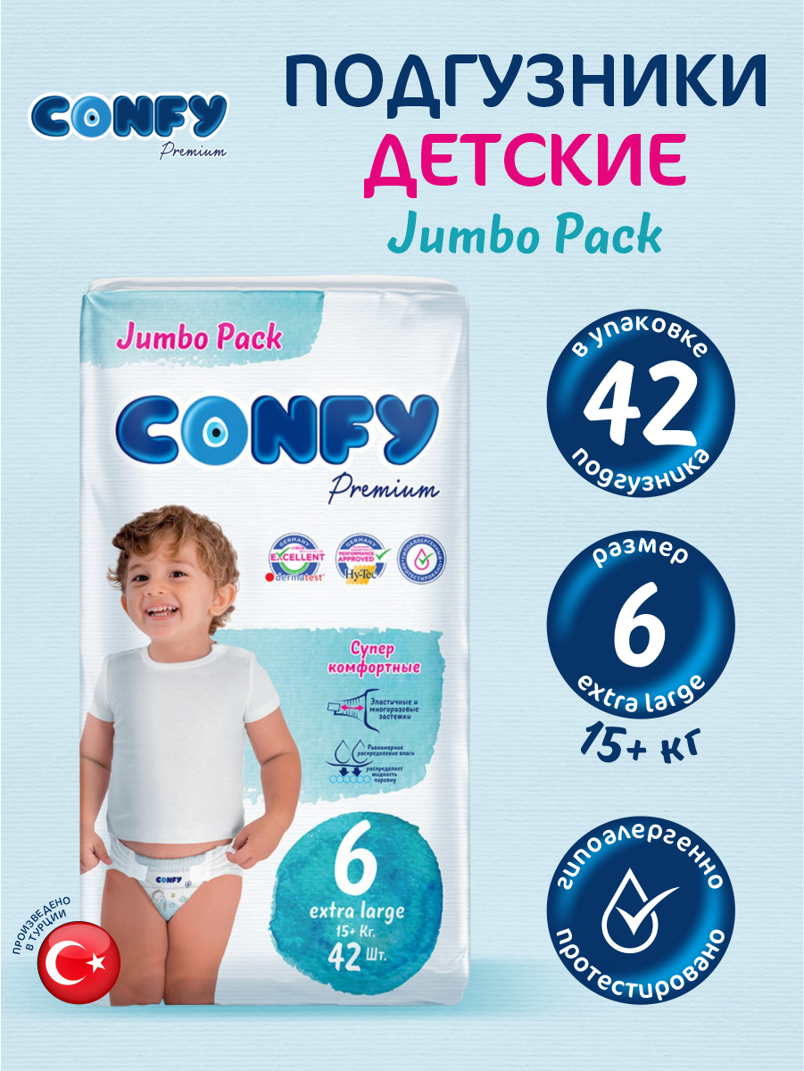 Подгузники Confy Premium Extra Large детские для мальчиков и девочек, 6 размер 15+ кг, 42 шт