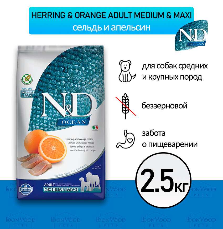 Сухой корм Farmina N&D Ocean Herring&Orange Adult Medium&Maxi, для взрослых собак средних и крупных пород, беззерновой, сельдь с апельсином, 2,5 кг