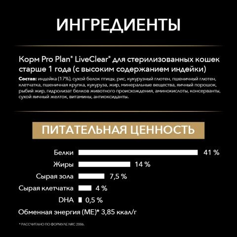 Сухой корм Pro Plan® LiveClear® для взрослых стерилизованных кошек, снижает количество аллергенов в шерсти, с индейкой, Пакет, 0,4 кг