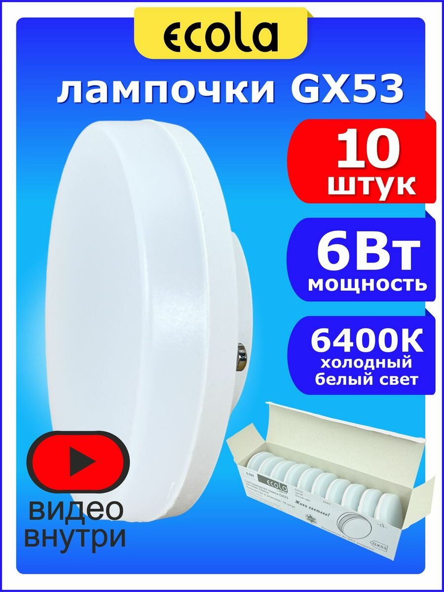 Купить Лампочка светодиодная Ecola Light GX53 LED. Мощность 6,0W 6400K Комплект 10 штук.